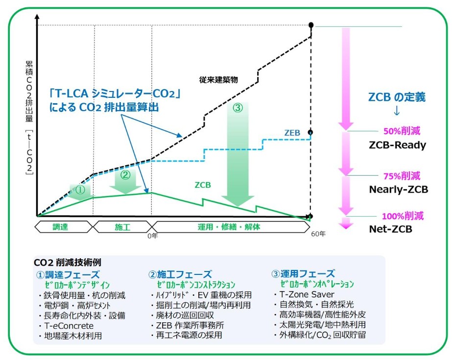 T-ZCBでは、建物のライフサイクルごとに累積CO₂排出量を可視化する「T-ZCBチャート」を生成。削減状況を一目で把握できる仕組みを整えています。
