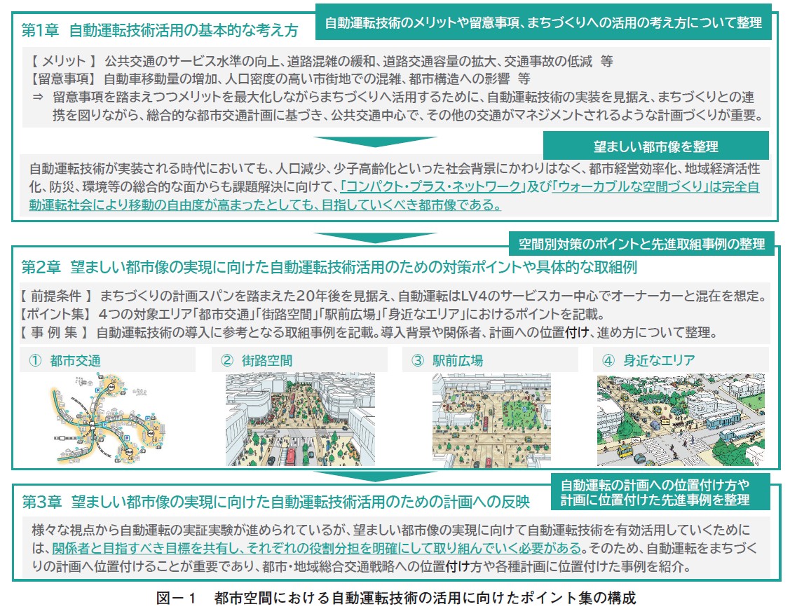 本ポイント集では、自動運転技術の活用に向けた取組の方向性を基に、都市・地域交通戦略を例として、計画への位置付け方を示している。