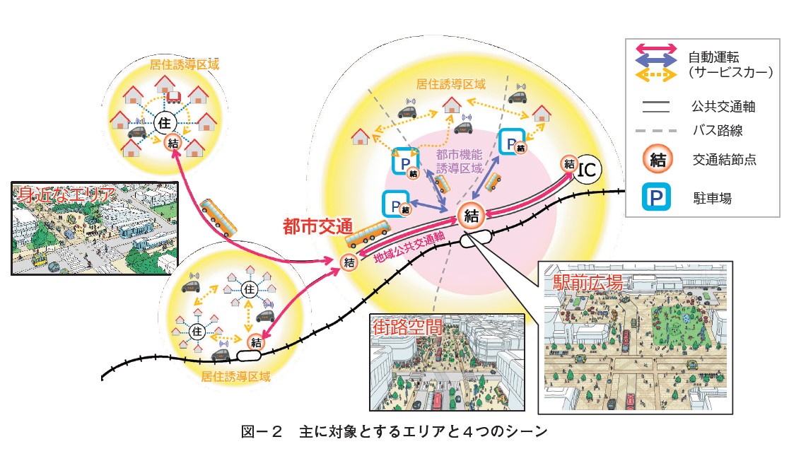 対象とするエリアは、主に都市部にて公共交通軸となる街路空間や結節点、都市機能誘導区域や居住誘導区域内(それらを結ぶ公共交通軸も含む)の限定されたエリア(図-2)としている。