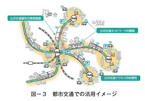 公共交通を維持・向上させながら望ましい都市構造の実現を図るためには、公共交通を優先して走行させたいエリア・路線(公共交通軸)の設定、計画、整備が望まれる。併せて、公共交通を優先するエリアへの自動車の流入抑制や、AI 技術等を活用した交通量予測に基づく所要時間の平準化をしながらフィーダーも含む公共交通を自動運転化することが考えられる。