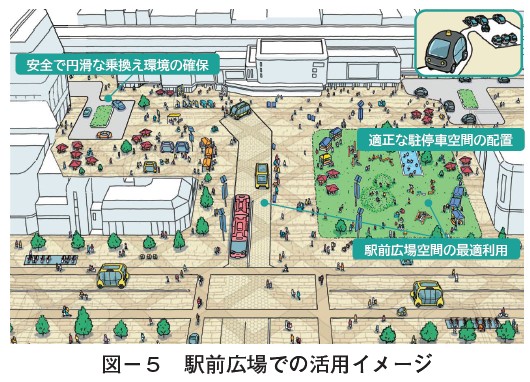 人々の移動・滞在の拠点となる駅前の広場空間は、多様な人々の活動があふれる空間への転換が重要となる。自動運転車両が普及することにより、乗降・待機場所の確保が課題となるが、自動運転車両の待機方法の合理化検討を行いながら、周辺市街地の駐車場や空きスペースを有効活用し、隔地での待機場所の確保やバースを集約化することで、広場空間の創出に繋がることが考えられる。