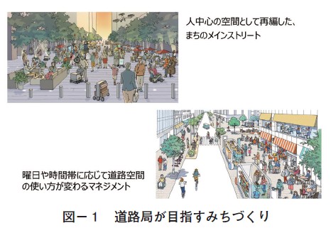 また、中心市街地の活性化や観光地のにぎわい創出への対応として、道路空間を活用したイベントやオープンカフェ等の取組が全国で広がってきた。加えて、電動キックボードや自動配送ロボットなど新たなモビリティの登場も、道路空間の「通行」機能の在り方を問い直している(図-1)。