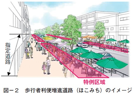 歩道と路肩等の柔軟な利活用を行う箇所において、ほこみち制度を活用する場合には、利便増進誘導区域内において、交通規制等により歩行者の円滑な通行を確保した上で、歩道と路肩部分又は歩道と車道部分について一体的な利活用を行うことを整理している。