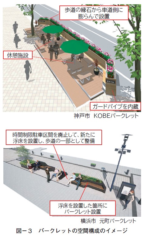 路肩部分も含めた利活用の代表例として、パークレットを整理している。