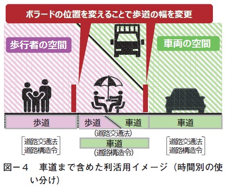 道路空間に余裕がない場合には、車道部分も含めた時間帯別の使い分けを整理している。