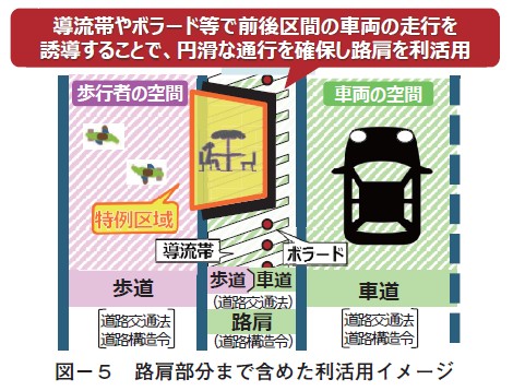 このように、ほこみち制度は人中心の道路空間形成に向けた重要な施策として位置付けられてきたが、実際の取組を進める中では、歩道内の利活用にとどまらず、路肩や車道を含めた道路空間全体の柔軟な使い方についても整理が求められるようになってきた。