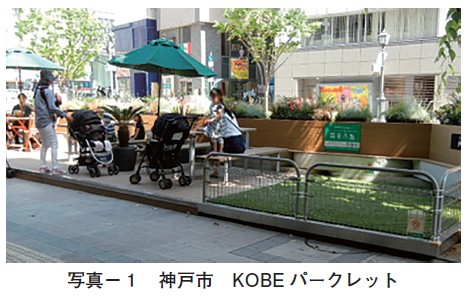 (1) 路肩部分を含めた利活用の事例(KOBE パークレット(神戸市))(写真-1)