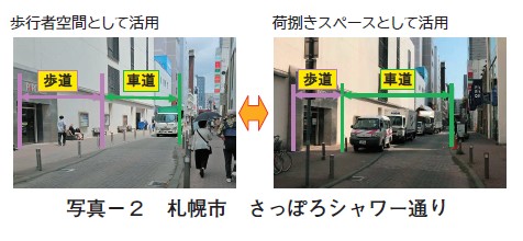 そのため、平成18年にさっぽろシャワー通りの再整備を実施し、道路空間の再編により荷捌きスペース・歩行者空間を確保し、時間帯別の使い分けが実施されている。