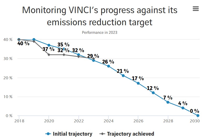 交通インフラ運営を担うVINCIオートルーツでは、2030年までに工事のカーボンフットプリントを2018年比で50%削減する目標を設定。