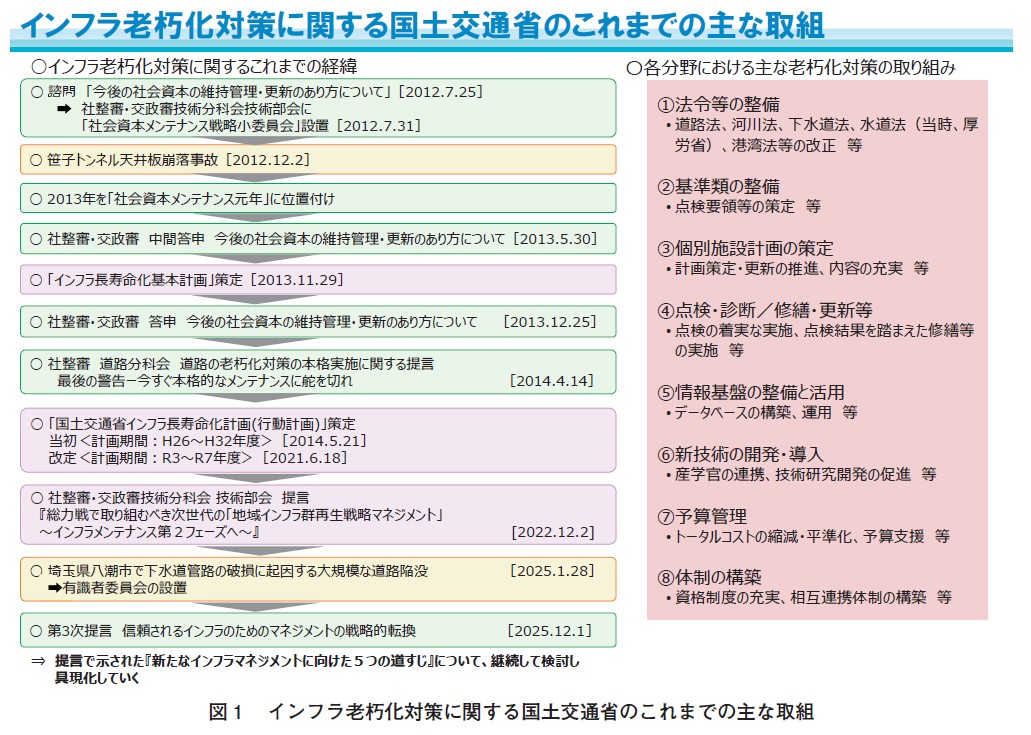 このような中で、2025(令和7)年1月28日に埼玉県八潮市において発生した下水道管破損に起因する道路陥没事故によって、適切にインフラの点検・修繕・更新を図るとともに、計画・設計・整備・修繕・改築などを統合的にマネジメントすることの重要性と不具合のあった際の国民生活への影響の大きさを再認識したところです。