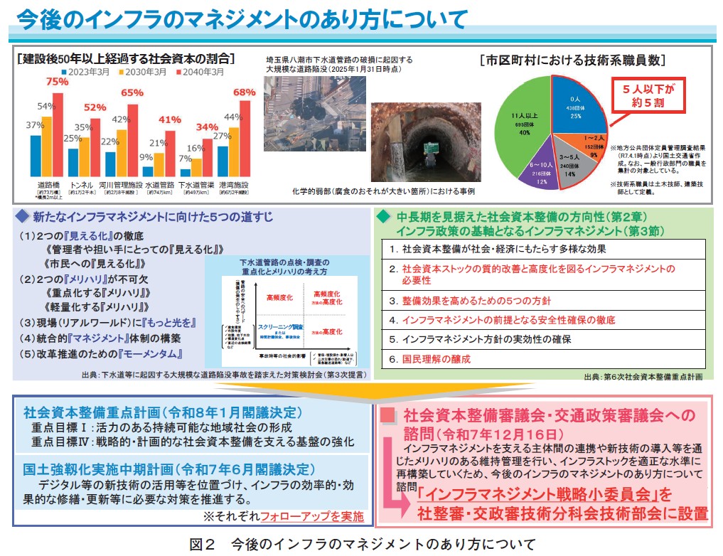 このため、令和7年12月16日に国土交通大臣より「今後のインフラのマネジメントのあり方」について諮問が行われ、同月25日、社会資本整備審議会及び交通政策審議会技術分科会の技術部会の下に、「インフラマネジメント戦略小委員会」(委員長:家田仁政策研究大学院大学特別教授)が設置されました(図2)。