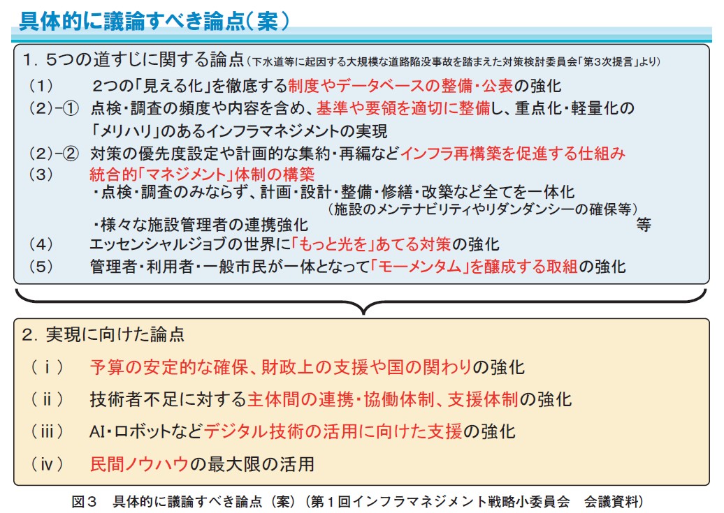 第3次提言を踏まえ、点検の方法等の効率化や地域の将来像を踏まえた、対策の優先度の設定や計画的な集約・再編等、限られた人員・予算で効率的なマネジメントをしていくメリハリや、適切な維持管理が容易に実施できるように設計段階からメンテナビリティを確保する他、社会的影響が大きい施設はリダンダンシーを確保する等、新たなインフラマネジメントという視点で議論を重ね、具現化に向けて取り組んでまいります。