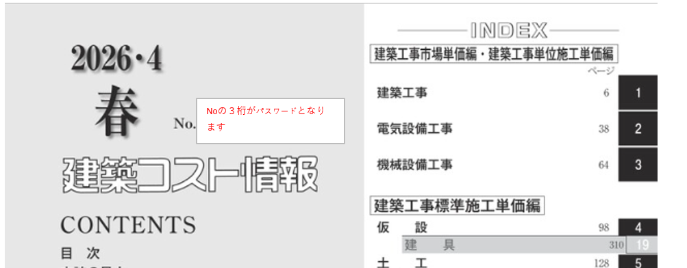 ・ダウンロードしたファイルを閲覧するには、季刊「建築コスト情報」および「デジタル建築コスト情報」2026年春(4月)号の目次欄に記載されているパスワードの入力が必要です。
